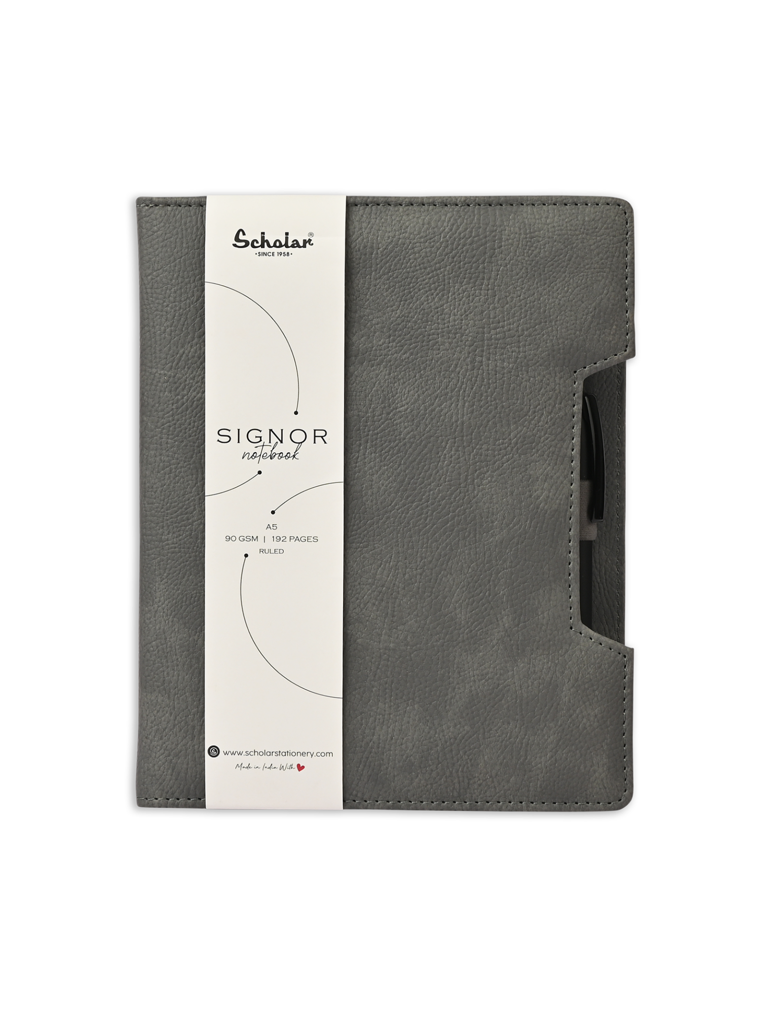 The Signor A5 ruled notebook is part of our premium collection that features a 90 gsm thick paper that works well with most writing mediums. The cover is designed in a way that the pen remains within the safety of the cover which protects it from damage. Premium vegan PU leather covers adorn this book in 4 amazing colours. Comes with a free pen that’s perfect for daily use.